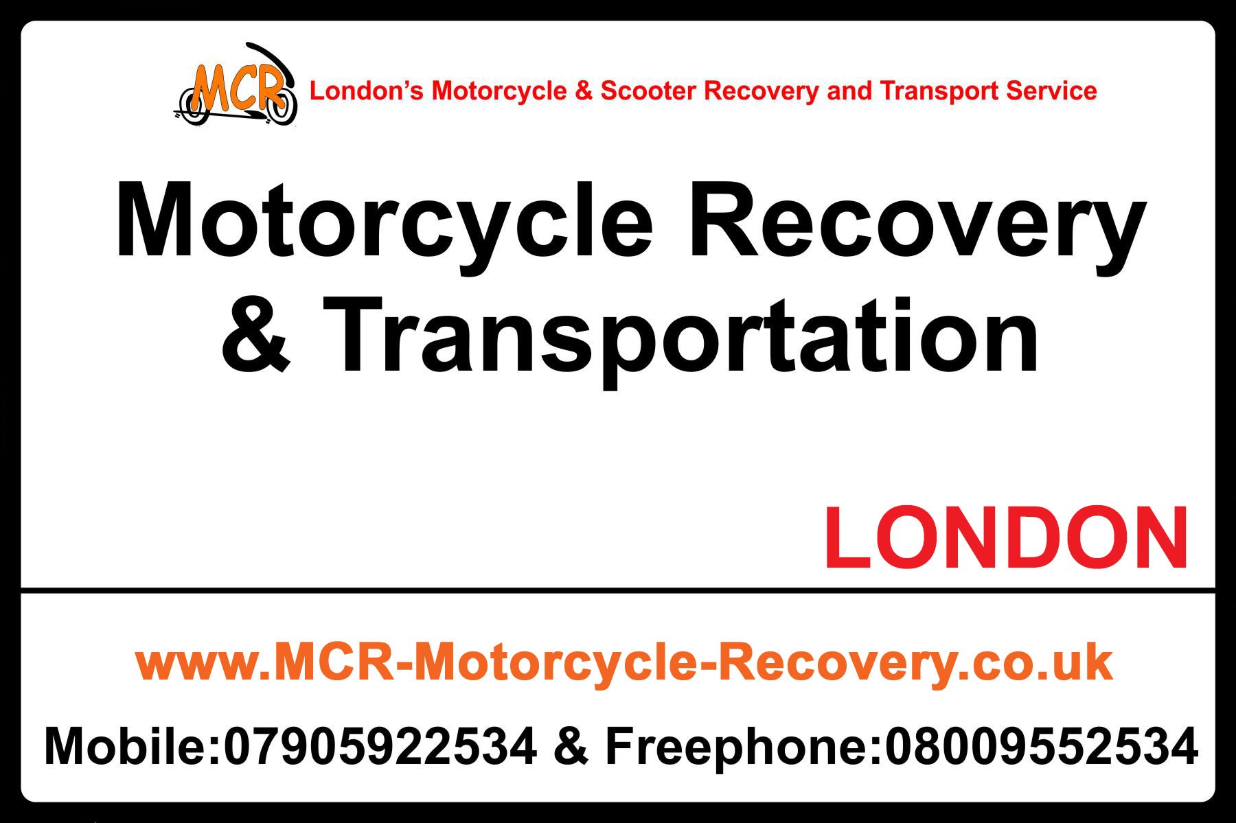 If your motorcycle or scooter has broken-down, won’t start, got a puncture, been stolen and recovered, or has been involved in an accident we at MCR Motorcycle Recovery contactableon on 07905922534 understand the stress this can bring trying to get it recovered. We also know this can be a very expensive experience if you accept the first price given and don’t “shop around” for prices. We were established back in 2006 and operate a recovery and transportation service solely for motorcycles and scooters in London and the Home Counties, as we have been in this business for many years we know and are constantly told by our customers that our rates are lower than many others advertising there services on the internet. By calling us you have nothing to lose and you could save a small fortune. We are reliable and professional, we use a bespoke built fully equipped Euro 6 recovery van. We believe motorcycles and scooters shouldn’t be on the back of Lorries, this practise also brings a higher price as they use more diesel.